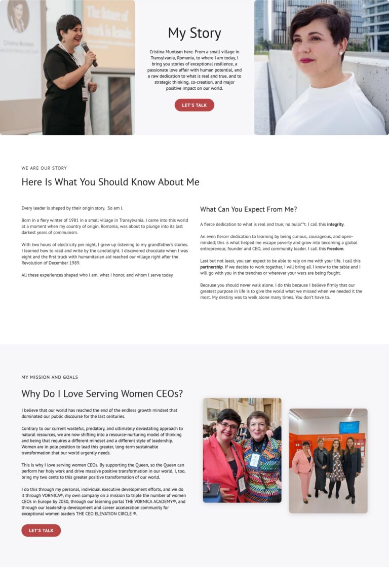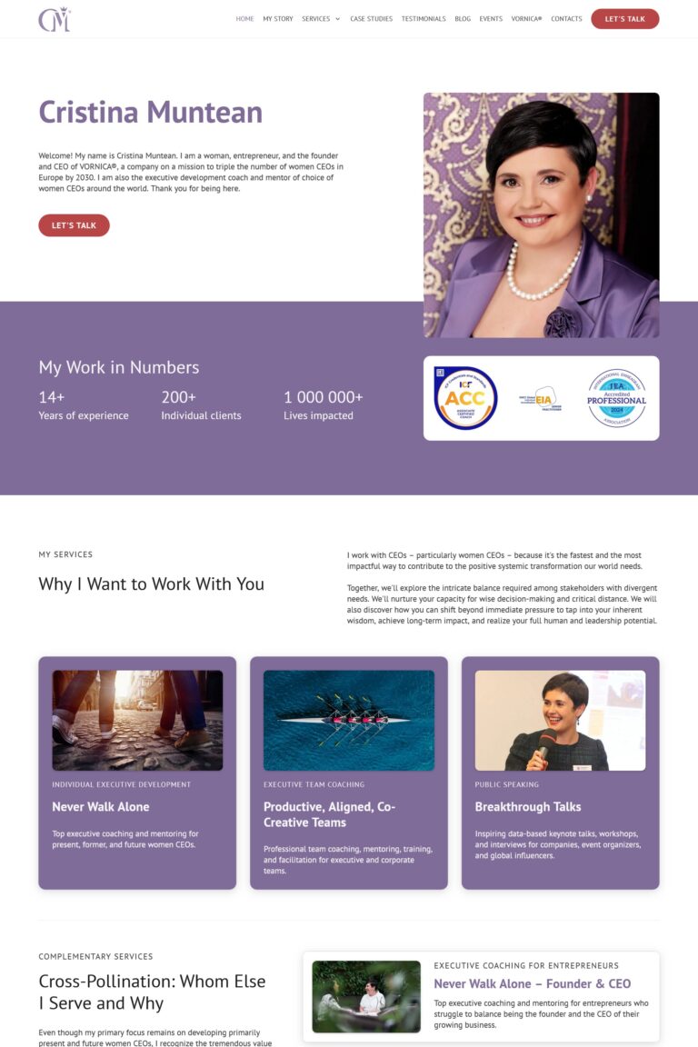 UX/UI design & development for Cristina Muntean, an entrepreneur and founder of of VORNICA®, executive coach and mentor, CEO whisperer, long-term client and a dear friend.